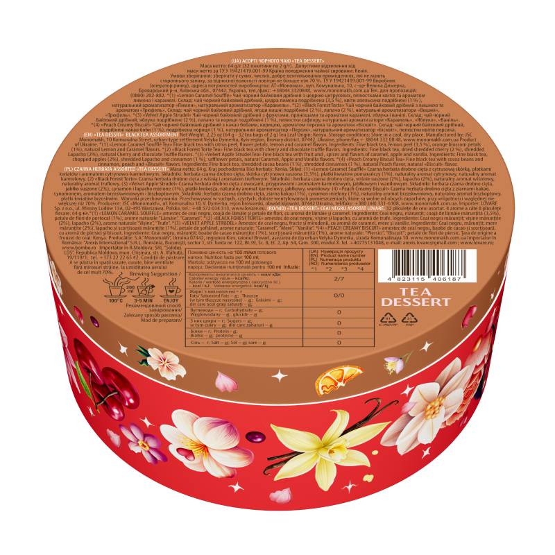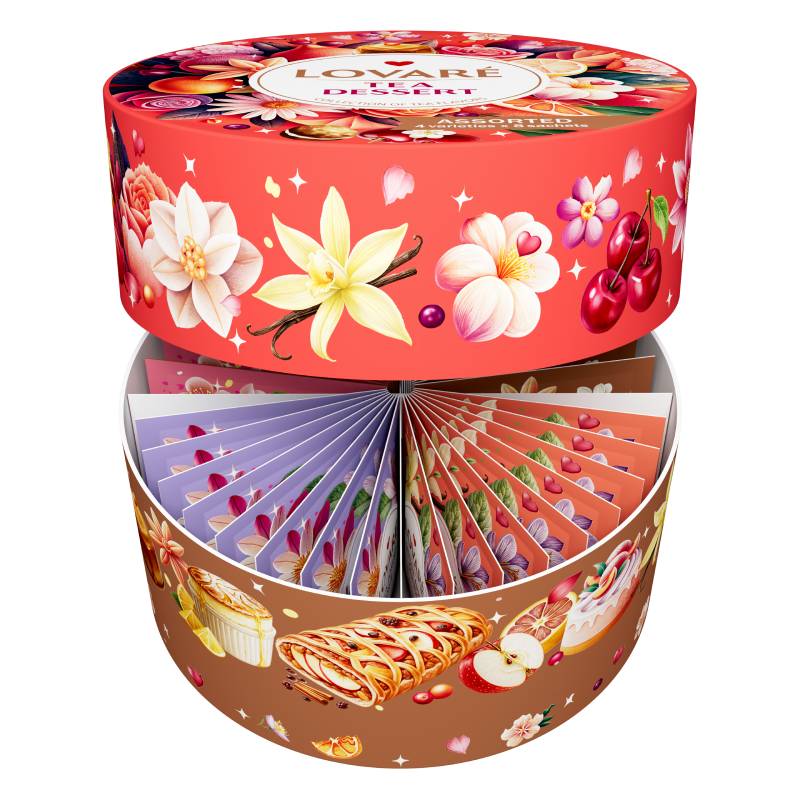 Lovare Tea Dessert to elegancki zestaw czarnych herbat aromatyzowanych, stworzony z myślą o miłośnikach słodkich, deserowych nut smakowych. Każda filiżanka to połączenie wyrazistej czarnej herbaty z aromatami inspirowanymi klasycznymi deserami – idealna alternatywa dla słodyczy.