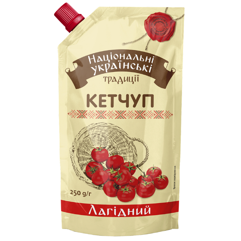 Ketchup „Łagodny” Narodowe Ukraińskie Tradycje to klasyczny ketchup pomidorowy o delikatnym, zrównoważonym smaku. Przygotowany na bazie dojrzałych pomidorów, bez ostrej nuty – idealny dla osób, które cenią tradycyjny smak i naturalną prostotę.